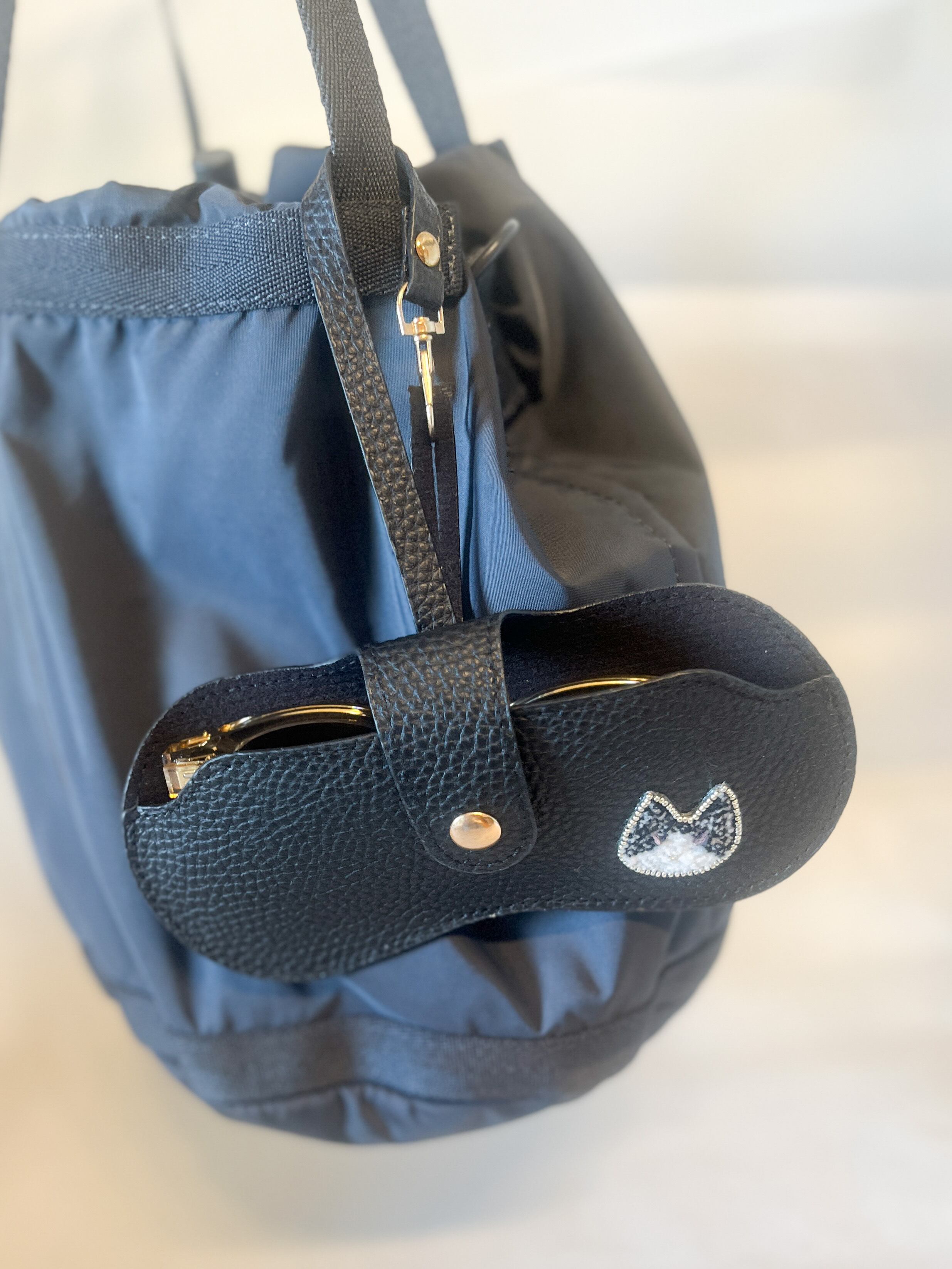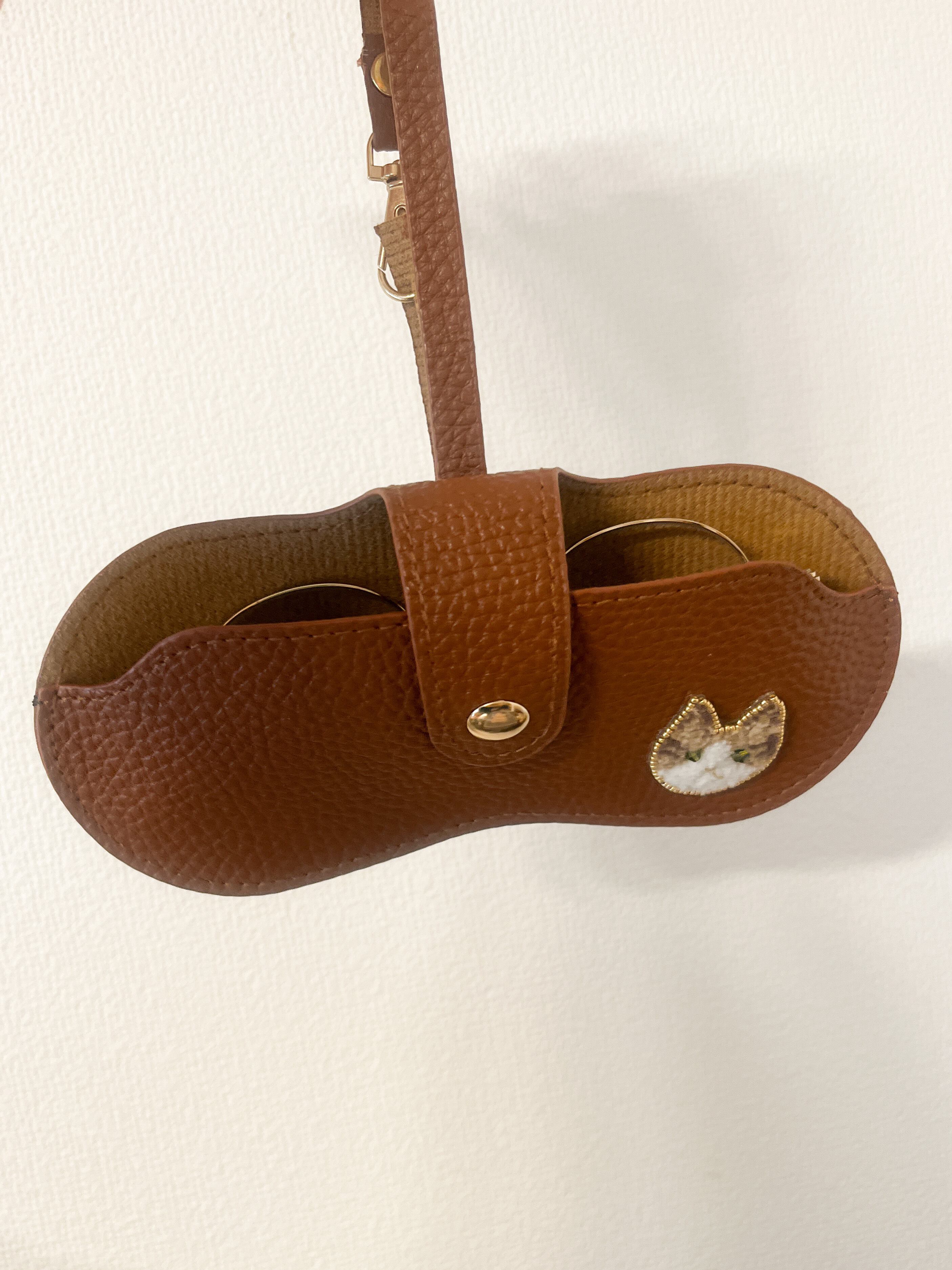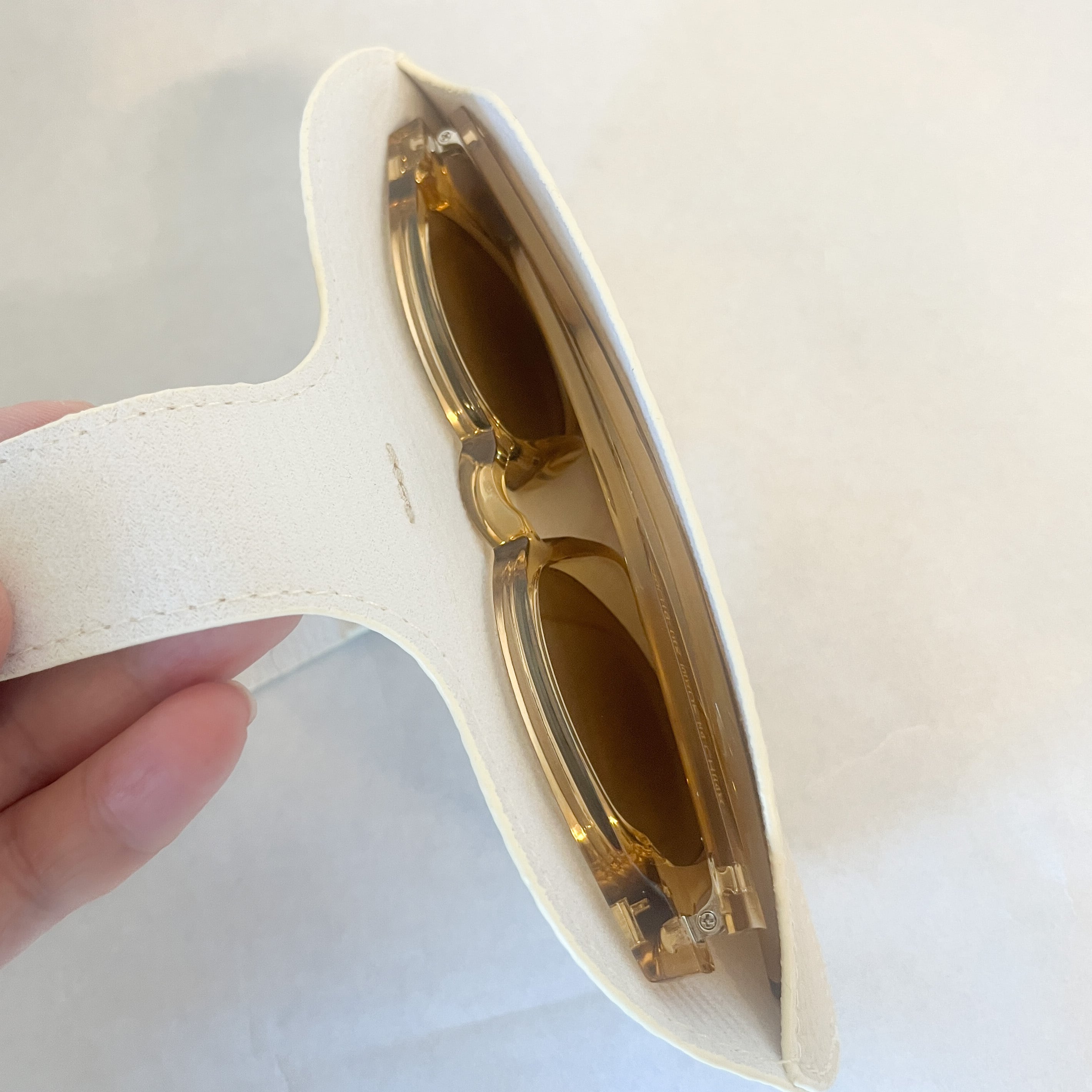 外側はしっかりとしたフェイクレザー、内側は柔らかい素材なので、眼鏡をそのまま入れていただいても大丈夫です。
