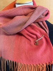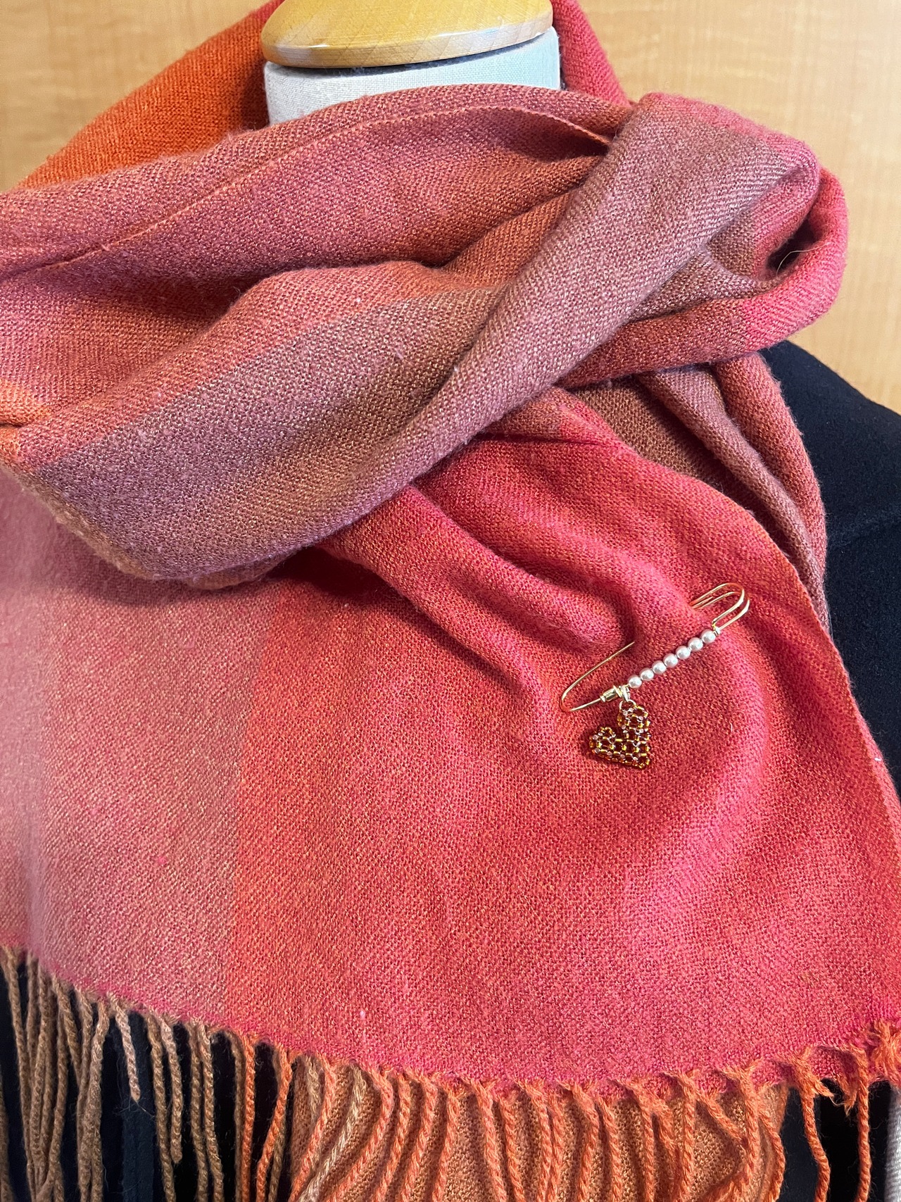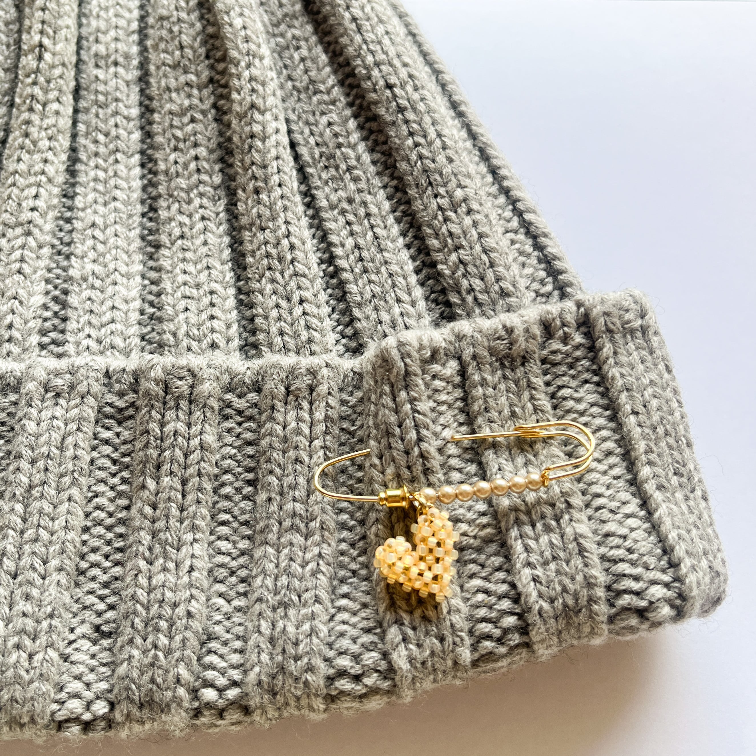 針が細めのキルトピンを使用しているのでマフラーを留めたりするほかに、衿元や帽子などブローチのようにお使いいただくのもおすすめです。