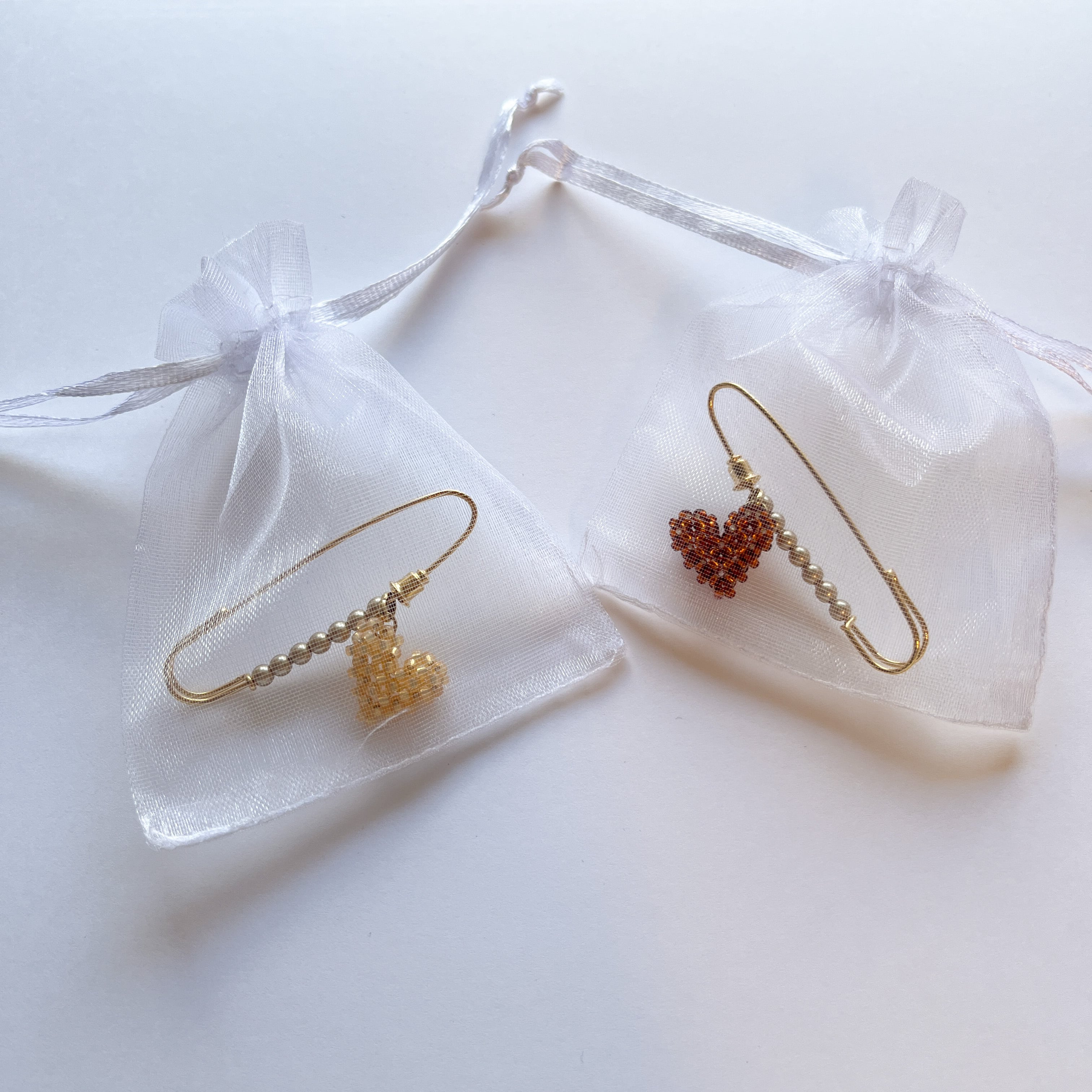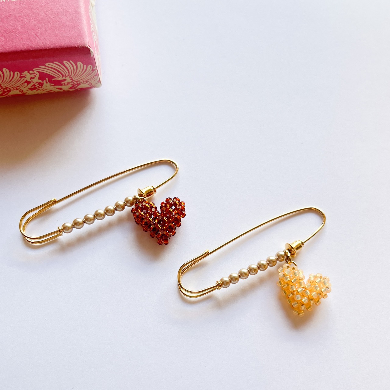 グラスビーズを立体的に編み上げたハートモチーフのキルトピンです。