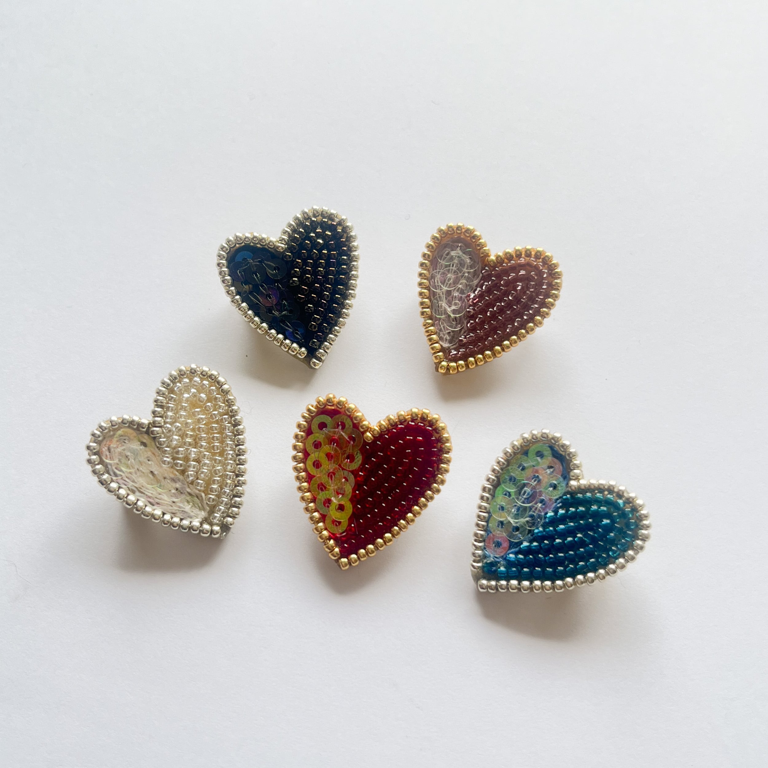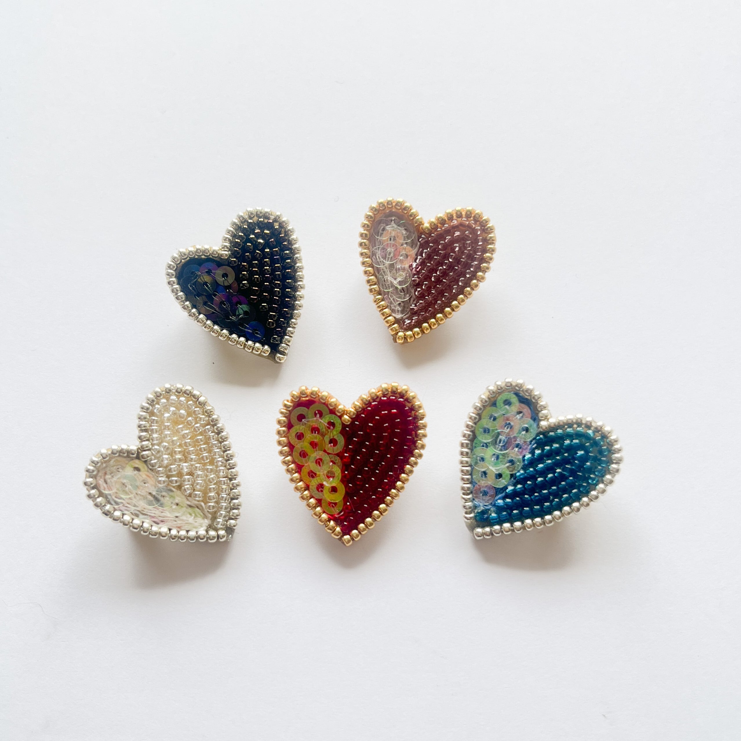 心臓をイメージして、半分はビーズを、もう半分にはチェーンステッチで刺繍をした上にスパンコールを敷きつめ、まわりには一粒約1.5ミリの特小ビーズをあしらいました。